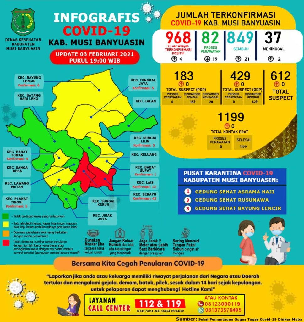 “Ada penambahan 21 kasus sembuh, 4 terkonfirmasi positif, dan 2 meninggal dunia per 3 Februari 2021,” ungkap Jubir Gugus Tugas Penanganan Covid-19 Muba, Povi Pada Indarta.