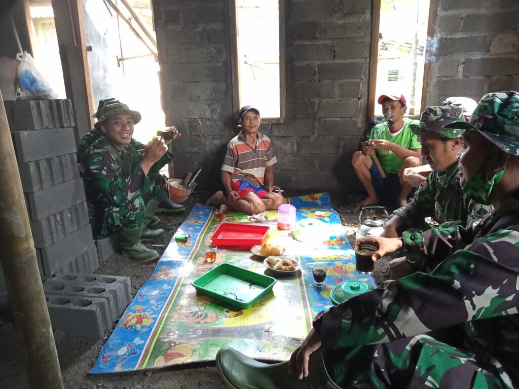 Kardi (37) dan Sarlan (41) disela istirahat kerja sekedar menghilangkan rasa letih mereka berbaur bersama anggota satgas dirumah Sardi (43) warga dusun Sarimulyo Rt 02 Rw 04 Desa Ketapang.