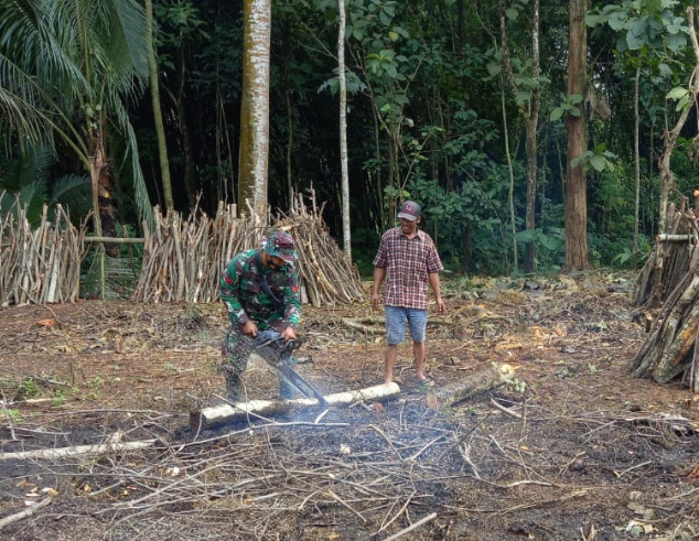 KORDANEWS — Anggota Satgas TMMD Ke-110 Kodim 0714/Salatiga Koptu Erwin membantu Sukudi (34) memotong kayu dengan mesin zenso di kebunnya di Dusun Sarimulyo Desa Ketapang Kecamatan Susukan Kabupaten Semarang, Sabtu (13/03/2021)