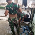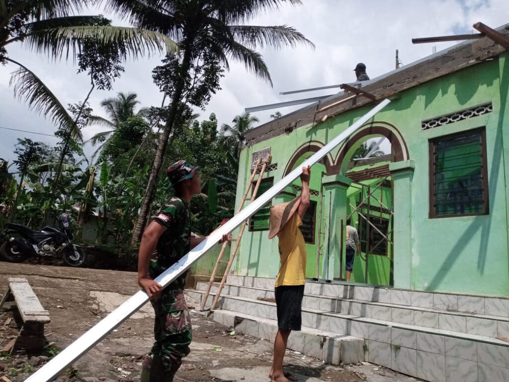 “Tolong dipegangkan ujung baja ringannya pak, biar lebih mudah untuk mendorong ke atas Musholla”, pinta Serda Oktavianus kepada Sumarno.