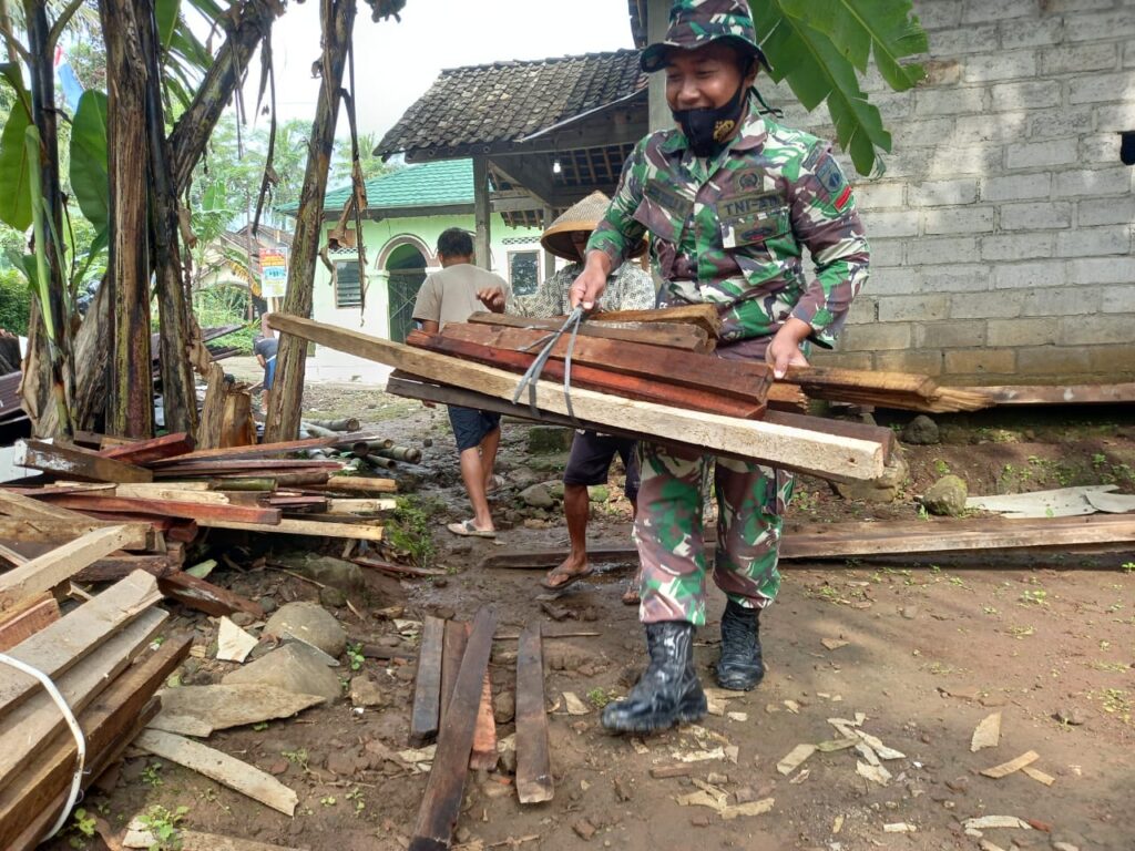 Muhdi (55 tahun) Dusun Sarimulyo RW 02 RW 05 yang tampak kerepotan mengangkat kayu bakar yang sedang dikumpulkannya, dengan sigap anggota Satgas TMMD segera turun tangan untuk membantunya.