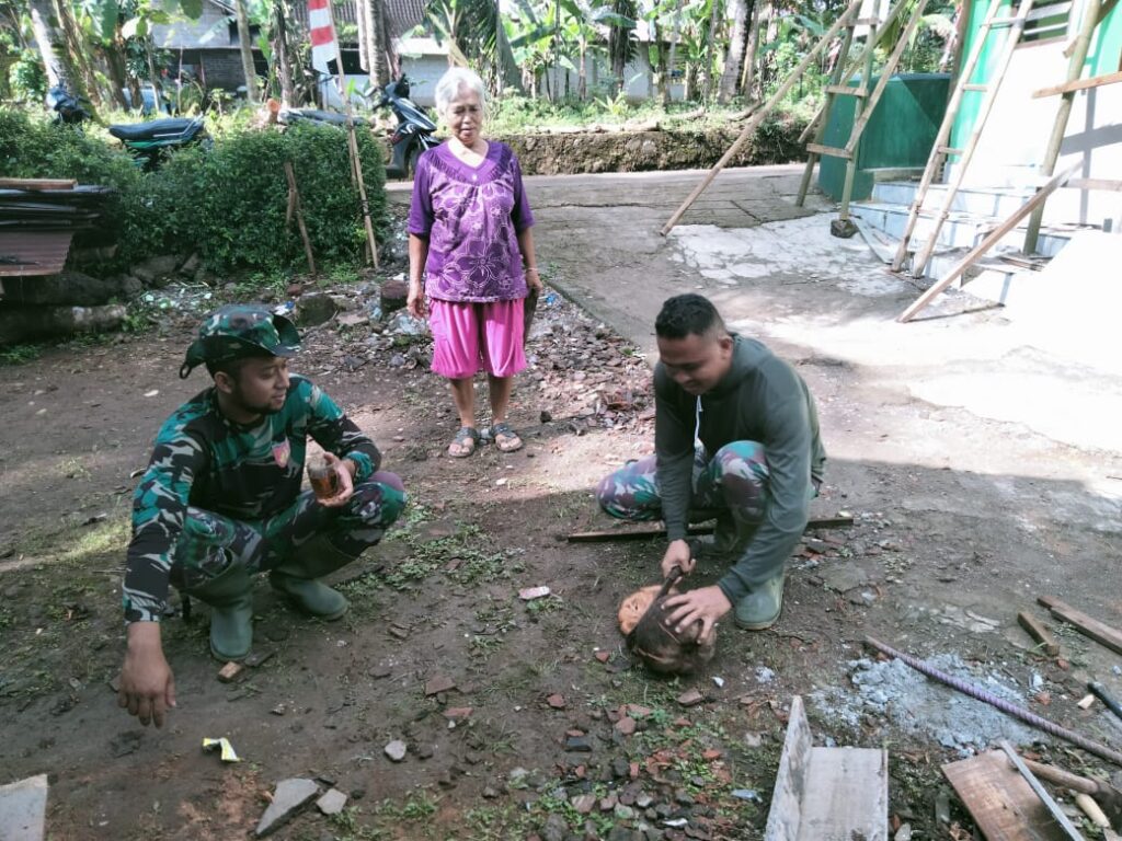 Saat ini Suswati sedang menikmati hasil tanaman kelapanya untuk memasak. Satgas TMMD Reguler ke-110 Kodim 0714/Salatiga di Desa Ketapang Kecamatan Susukan Kabupaten Semarang datang untuk membantu mengupaskan kelapa dari serabutnya, tentu saja hal ini membuat senang Suswati.