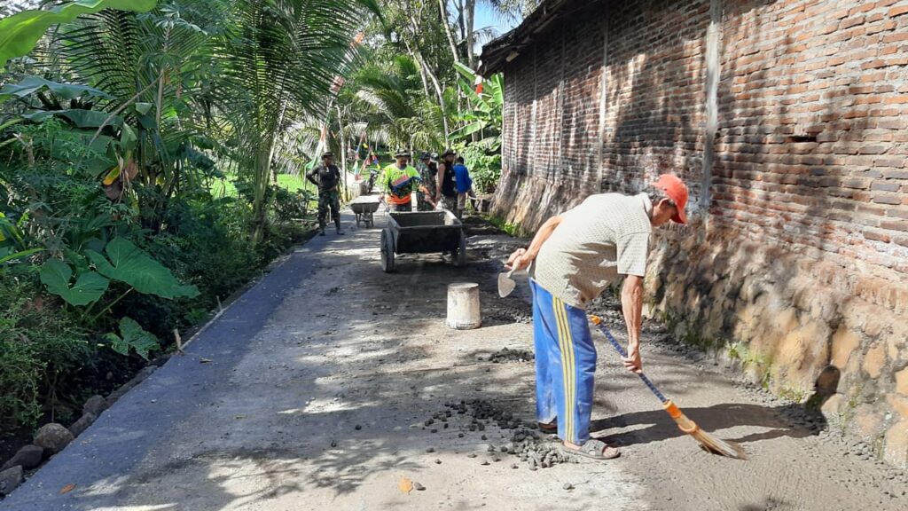 Sukirno(63) salah satu warga, dengan menggunakan sapu lidinya berusaha memberikan perawatan jalan yang sudah jadi, dan sedikit memberikan tambalan, ada sebagian jalan yang harus diberikan tambahan untuk pengecoran secara manual agar terlihat rapi dan lebih awet dalam penggunaannya.
