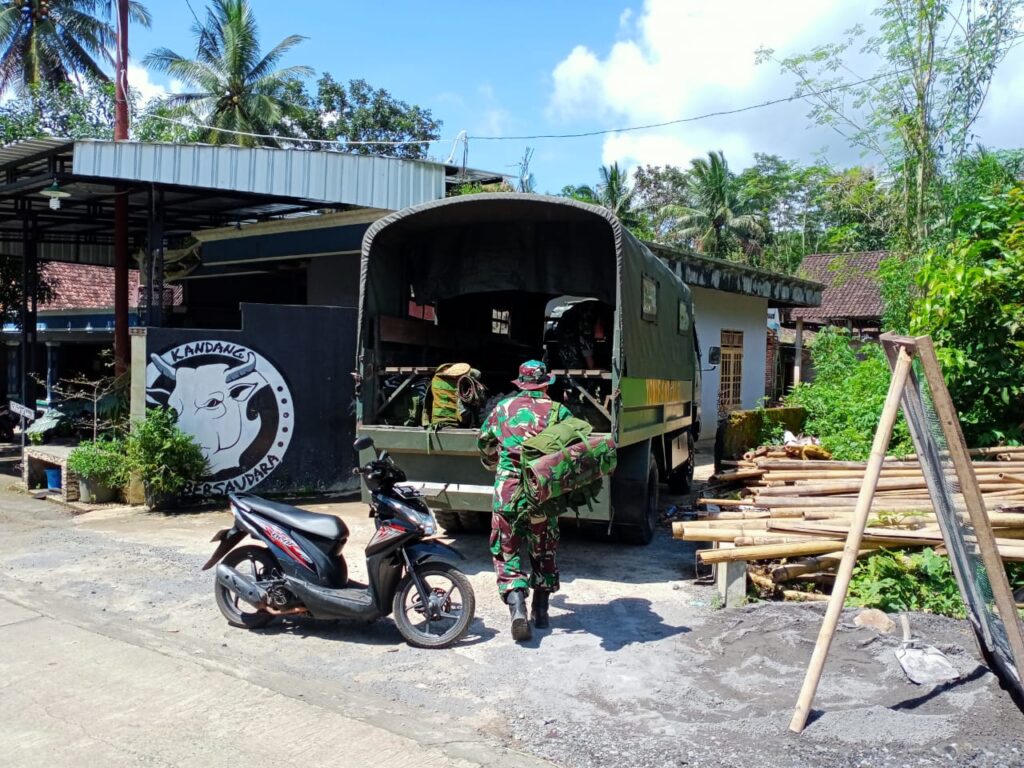 Dijemput dengan truk dari kesatuan, para Anggota Satgas TMMD yang berasal dari Batalyon 410/Alugoro Blora, bersiap untuk kembali ke home basenya.