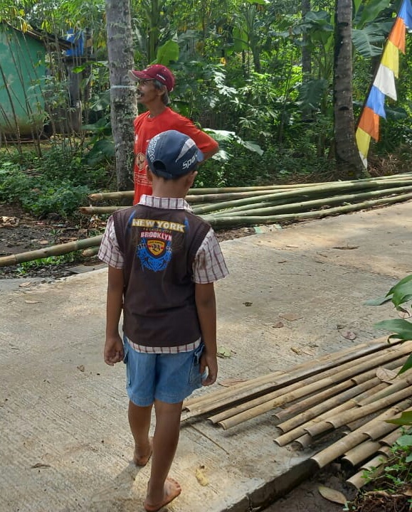 Karsono(57) warga Dusun Sarimulyo Rt 03 Rw 01 Desa Ketapang bersama bocah kecil Amir(11) yang tidak menggunakan alas kaki menikmati jalan yang sudah jadi sambil membantu karsono melanjutkan pekerjaan perbaikan rumahnya.