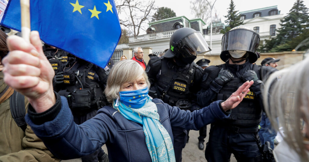 A woman holds an EU flag next to police officers during a protest over the Russian intelligence services alleged involvement in an ammunition depot explosion in Vrbetice area in 2014, outside the Russian Embassy in Prague, Czech Republic April 18, 2021. REUTERS/David W Cerny