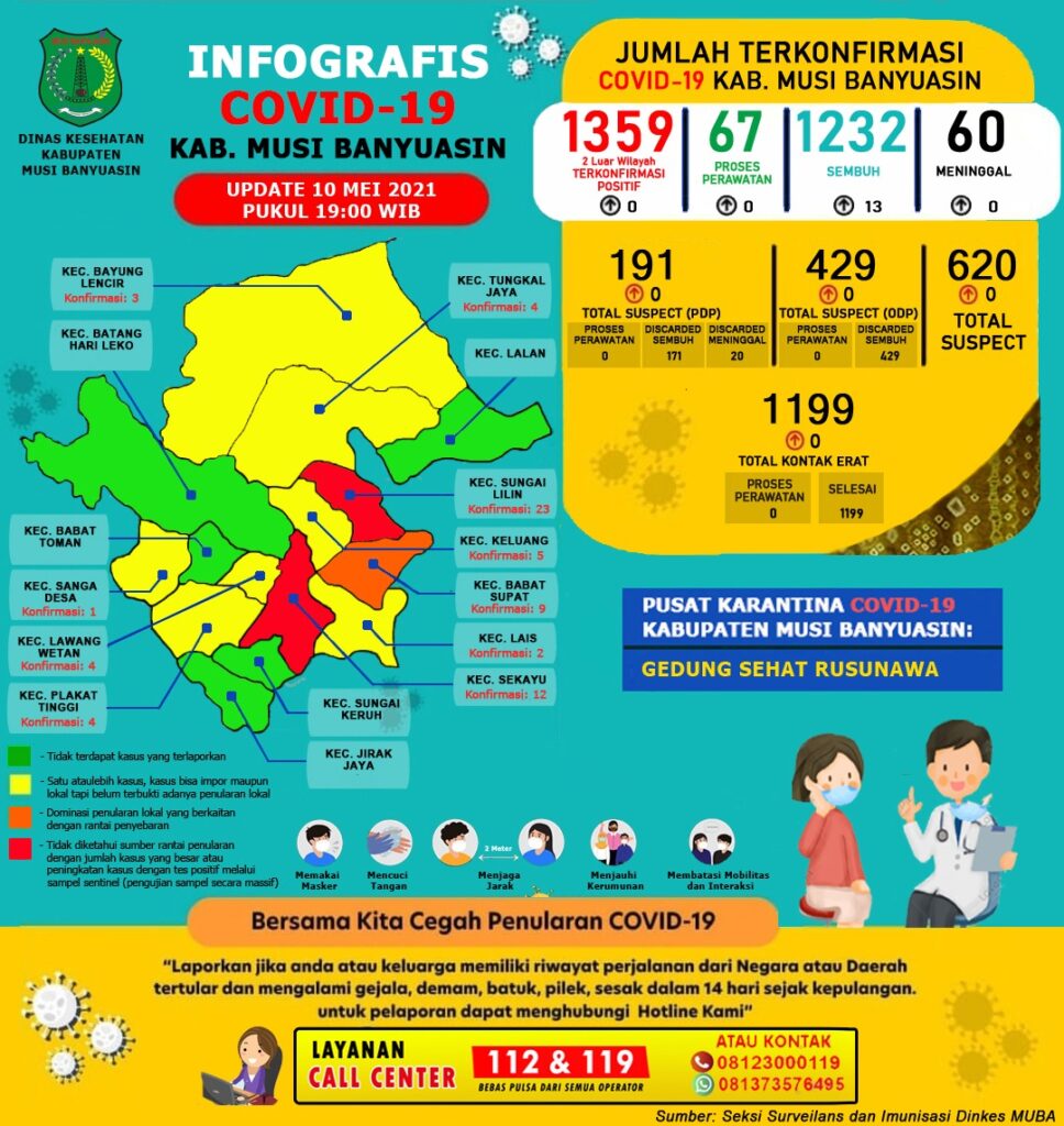 Kadin Kominfo Muba ini menerangkan, hingga 10 Mei 2021 ada sebanyak 1359 kasus diantaranya 1232 kasus sembuh. “Kemudian, 67 masih dirawat, dan 60 kasus meninggal dunia,” urainya.