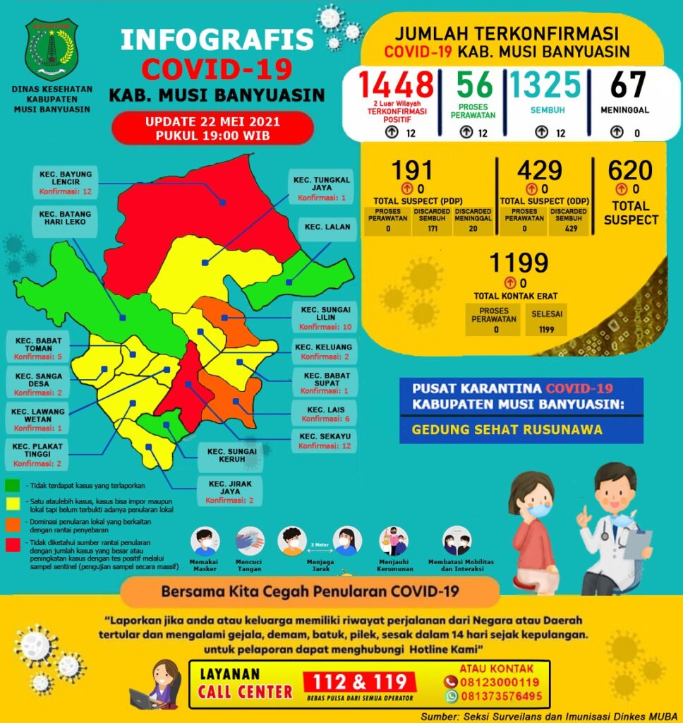“Ada penambahan 12 kasus sembuh dan 12 kasus positif per 22 Mei 2021,” ungkap Jubir Gugus Tugas Penanganan Covid-19 Muba, Seftiani Peratita.