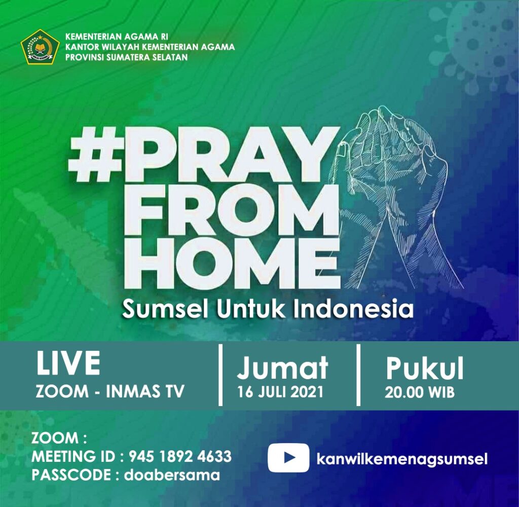 Kakanwil Kemenag Sumsel Dr. Drs. H. Mukhlisuddin SH, MA ditemui Rabu (14/7) pagi menuturkan, gerakan Sumatera Selatan Melangitkan Doa Agar Pandemi Segera Sirna merupakan tindak lanjut dari kegiatan PrayFromHome yang dilaksanakan Kemenag RI secara daring pada 11 Juli lalu. Menurutnya, format kegiatan juga akan digelar serupa dengan PrayFromHome yang lalu.