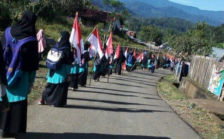 Ketua Pelaksana kegiatan Ustadz Alpen Wulandari, masing masing santri membawa bendera merah putih selama Long March sepanjang 10 Kilometer.