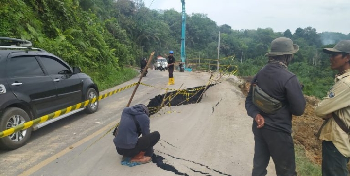 Keretakan jalan lintas Sumatera (Jalinsum) tersebut, sudah memakan lebih dari separuh jalan. Guna mengantisipasi longsor kian meluas, pihak dari Proyek mengambil langkah P3K.