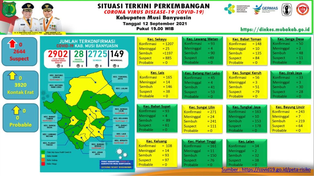 “Tidak ada penambahan kasus per 12 September 2021,” ungkap Jubir Gugus Tugas Penanganan Covid-19 Muba, Herryandi Sinulingga.