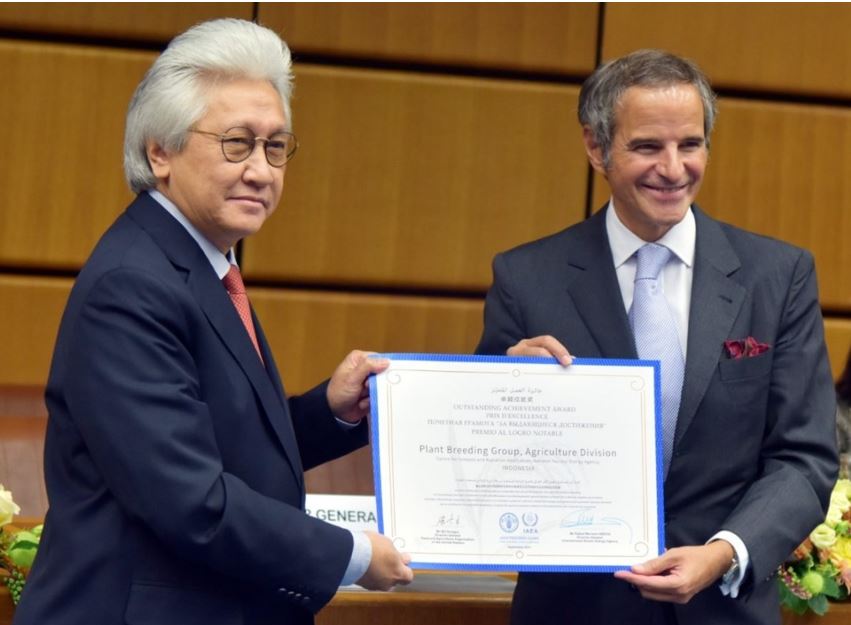 KORDANEWS – Indonesia melalui Organisasi Riset Tenaga Nuklir (sebelumnya bernama BATAN) Badan Riset dan Inovasi Nasional (BRIN) mendapat penghargaan (outstanding achievement award) dari Badan Pangan Dunia atau FAO dan Badan Atom Dunia atau IAEA. Penghargaan disampaikan Direktur Jenderal (Dirjen) IAEA Rafael Mariano Grossi kepada Duta Besar (Dubes) RI untuk PBB Darmansjah Djumala pada rangkaian persidangan IAEA General Conference ke-65, di Markas PBB Wina, Austria, Senin (20/09/2021). Penghargaan ini diberikan atas capaian riset dan pemanfaatan teknologi nuklir di Indonesia melalui Organisasi Riset Tenaga Nuklir (ORTN) di bidang pemuliaan tanaman pangan.