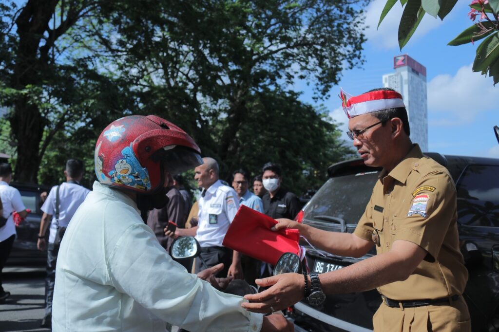 KORDANEWS-Harnojoyo selaku Walikota Palembang turun kejalan, Simpang Lima Dewan Perwakilan Rakyat Daerah (DPRD) Provinsi Sumsel (Sumatera Selatan) guna menghampiri satu persatu kendaraan roda dua dan roda empat untuk membagikan bendera merah putih bersama Forum Komunikasi Pimpinan Daerah (Forkompinda) yang berlangsung selama 15 menit, membuat arus menjadi tersendat dikawasan tersebut.