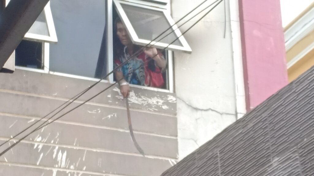 Sebelum diamankan pria tersebut sempat membakar ruangan lantai dua dan mengancam orang yang berada dibawah dengan mengancungkan senjata tajam jenis perang.