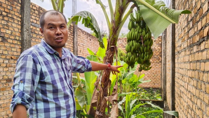 “Setiap hari saya jaga, kemudian daunnya juga saya potong supaya buah pisangnya cepat besar. Karena pisang ini baru pertama kali berbuah,” lanjutnya.