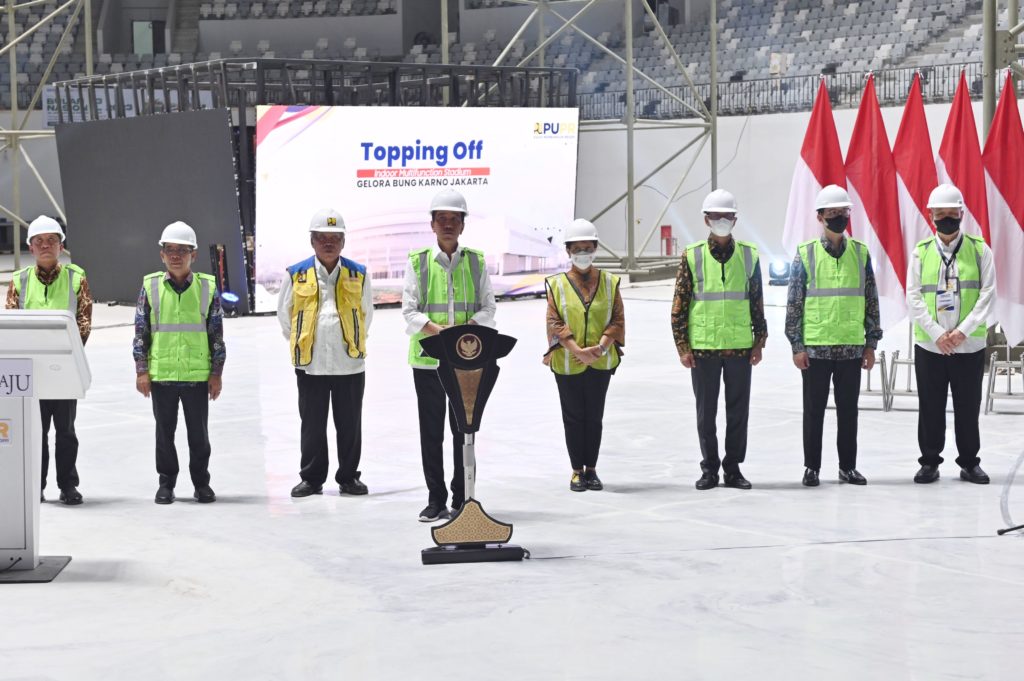 “Dengan mengucap bismillahirrahmanirrahim pada sore hari ini topping off Indoor Multifunction Stadium Gelora Bung Karno saya nyatakan telah selesai,” ujar Presiden.