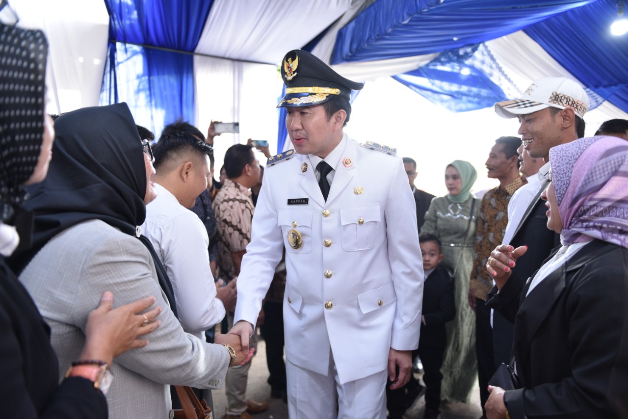 Masyarakat menyambut kedatangan Kaffah usai dilantik oleh Gubernur Sumsel Herman Deru di Griya Agung Palembang.