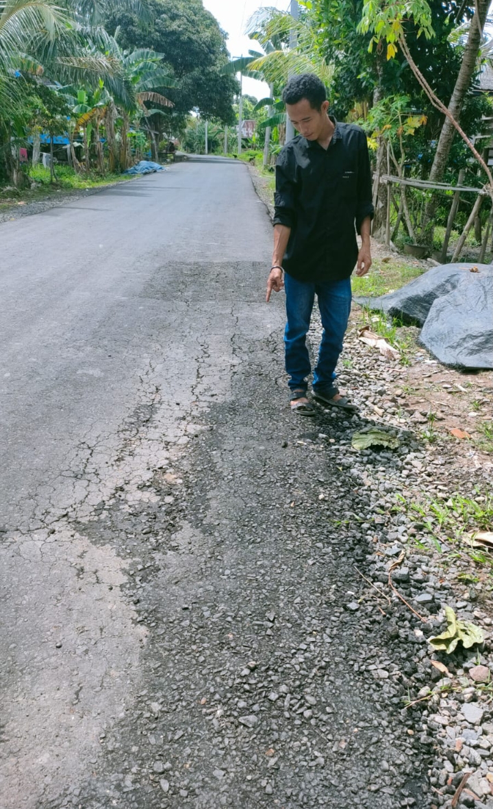 “jalan tersebut sangat tipis bahkan dapat di congkel dengan tanggan apalagi menggunakan cangkul, dan kami masih tetap bersyukur karena masih ada pembangunan di desa kami’’. Pungkasnya.