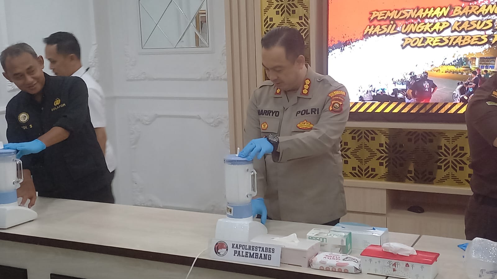 Kapolrestabes Palembang, Kombes Pol Harryo Sugihhartono bersama Kasat Narkoba, AKBP Mario Ivanry mengatakan, bahwa barang bukti yang di blender ini, merupakan ungkap kasus dari dua laporan polisi (LP).