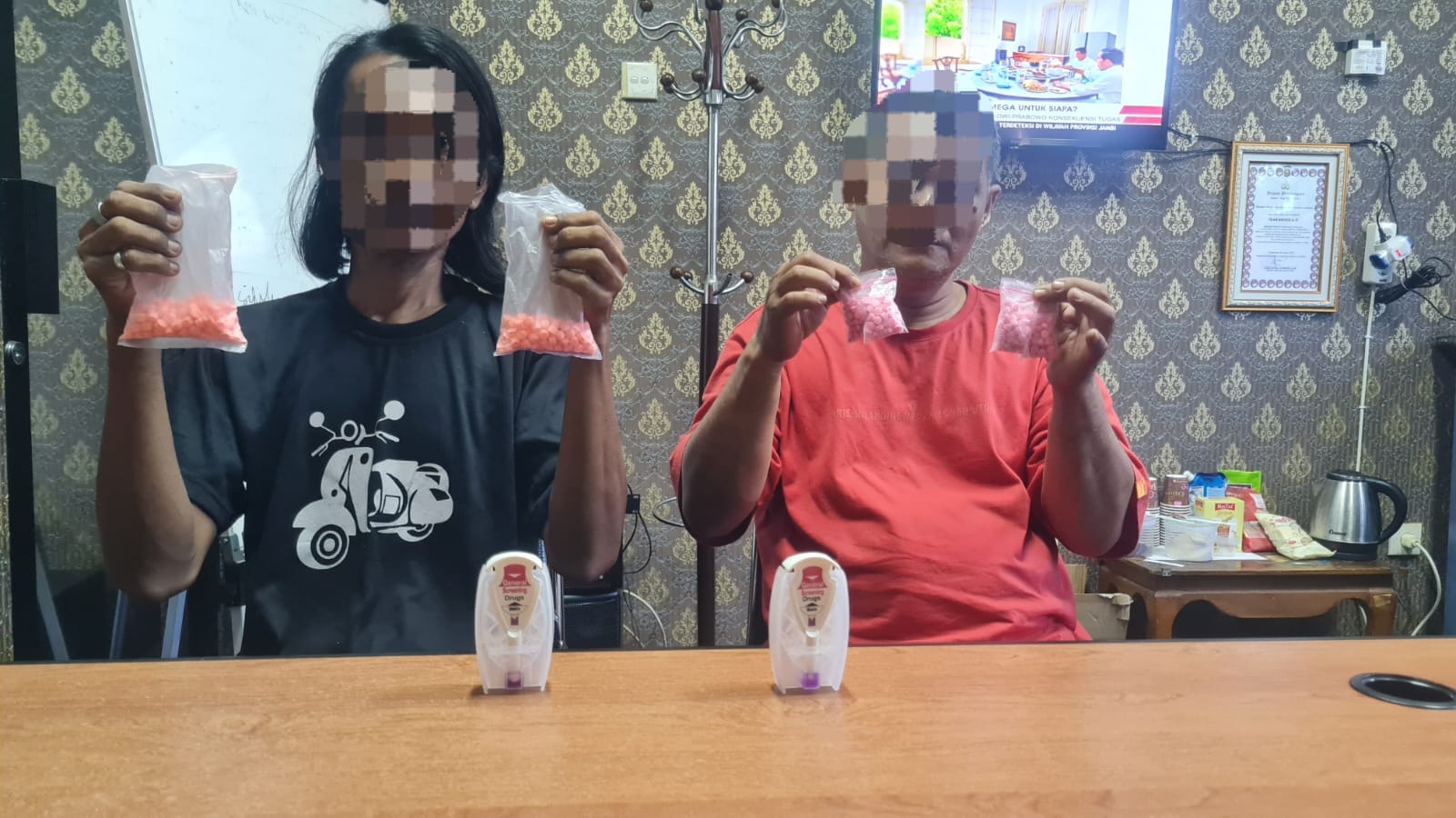 Atas perbuatannya melakukan tindak pidana tanpa hak dan melawan hukum, menawarkan untuk dijual, menjual, membeli, menerima, menjadi perantara dalam jual beli, memiliki, menyimpan hingga menguasai atau menyediakan ekstasi tersebut, keduanya kini resmi diterima menjadi tersangka.