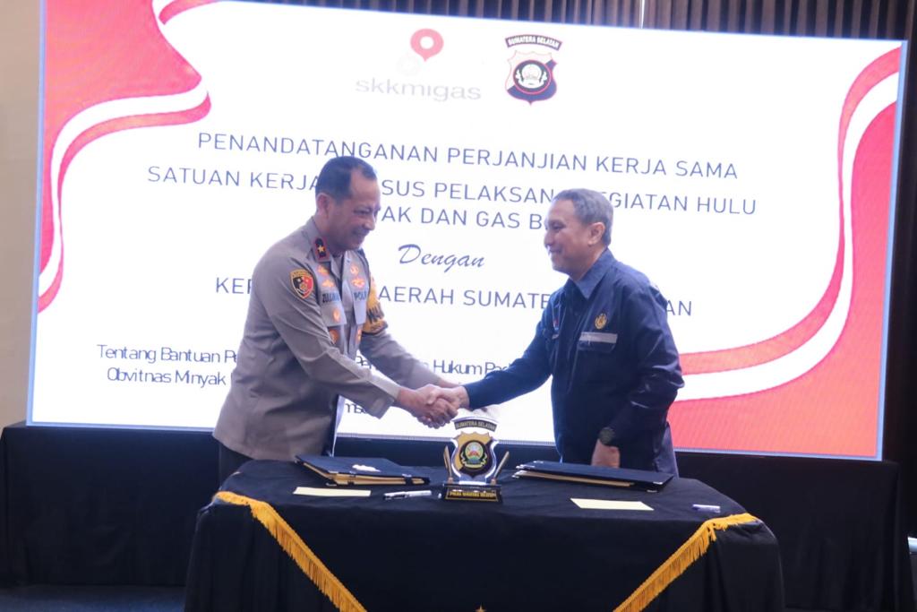 Deputi Dukungan Bisnis SKK Migas, Rudi Satwiko bersama Kapolda Sumsel yang diwakili oleh Wakapolda Sumsel, Brigjen Pol. M. Zulkarnain, S.I.K., M.Si melakukan seremoni penandatanganan Perjanjian Kerja Sama (PKS) tentang Pengamanan dan Penegakan Hukum Obyek Vital Nasional Minyak dan Gas Bumi pada Kontraktor Kerja Sama (KKKS) di Provinsi Sumsel pada Rabu (13/12) di Gedung Promoter Polda Sumsel.