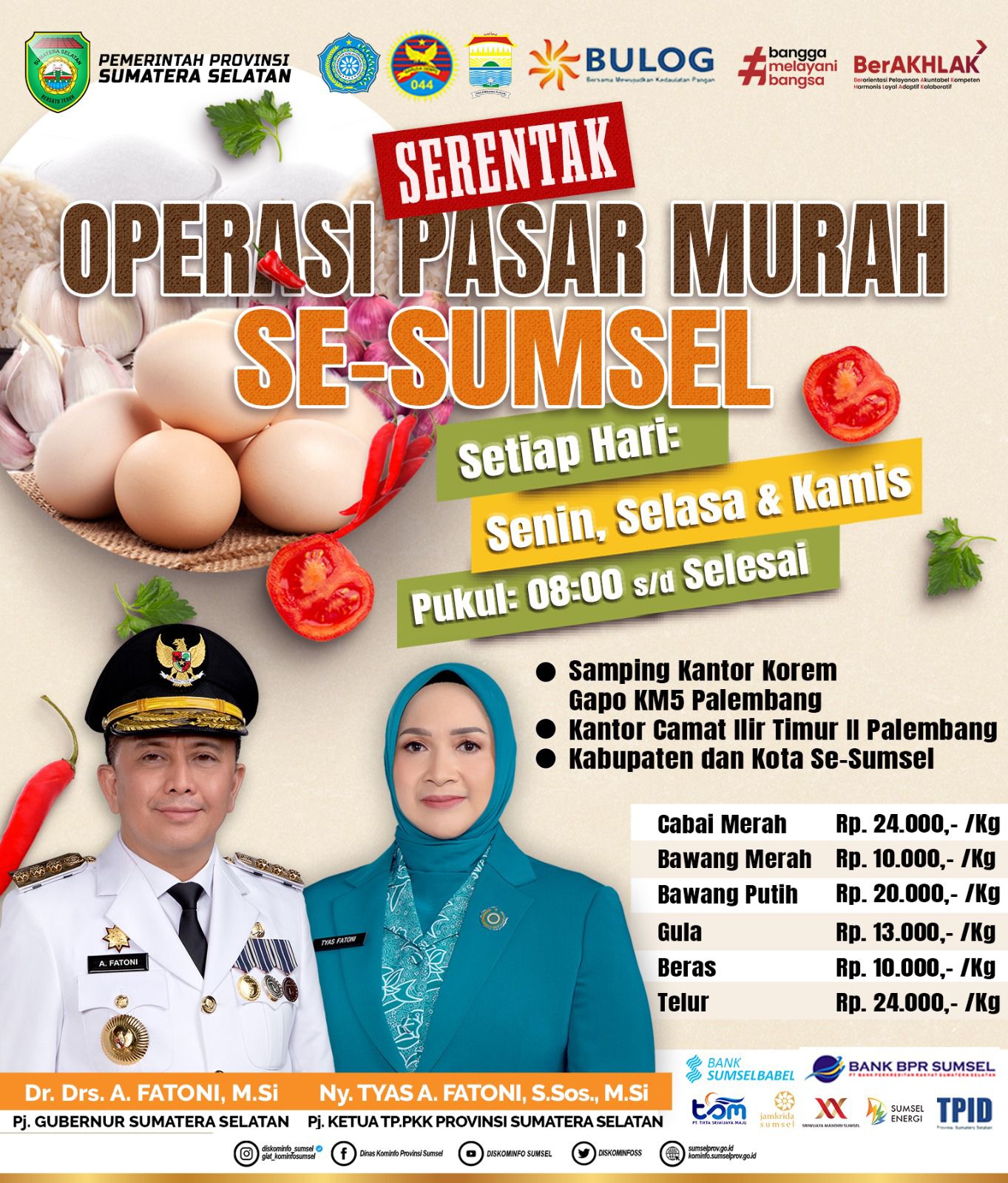 Sejumlah bahan pokok yang dijual dengan harga subsidi, di antaranya cabai merah dijual dengan harga Rp 24 ribu/kg, bawang merah Rp 10 ribu/kg, bawang putih Rp 20 ribu/kg, gula pasir Rp 13 ribu/kg, beras Rp 10 ribu/kg dan telur Rp 24 ribu/kg.