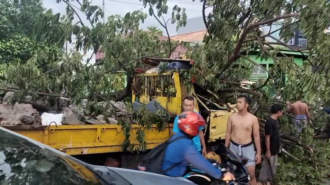 Ketua RT 10 Wahyu menceritakan kejadian, berawal truk dari arah under pass simpang patal mengarah simpang Polda. Tiba-tiba di lokasi kejadian pohon besar ini langsung menimpa truk begitu saja.