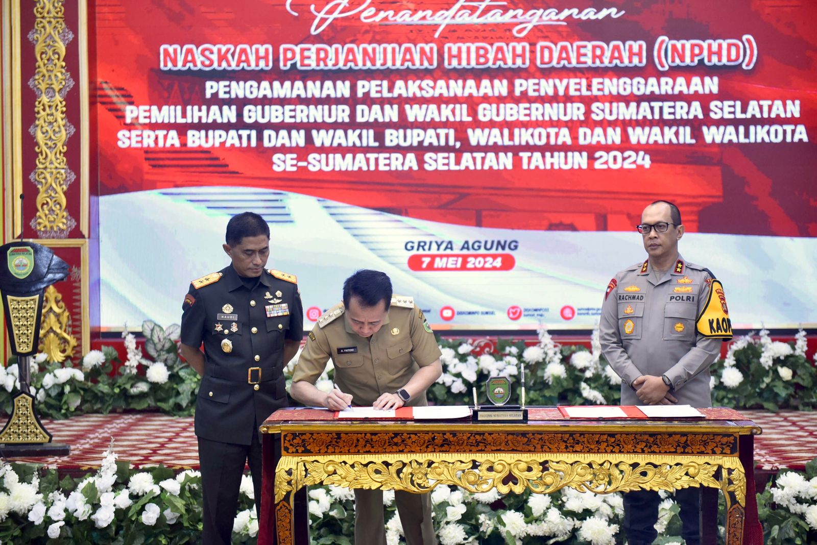 Kordanews -Penjabat (Pj) Gubernur Sumatera Selatan (Sumsel) Agus Fatoni menandatangani Naskah Perjanjian Hibah Daerah (NPHD) untuk pengamanan penyelenggaraan Pemilihan Kepala Daerah (Pilkada), Pemilihan Gubernur dan Wakil Gubernur Sumsel, Bupati dan Wakil Bupati serta Walikota dan Wakil Walikota se-Sumsel tahun 2024. Kegiatan ini berlangsung di Griya Agung, Palembang, Sumatera Selatan, Selasa (7/5/2024).