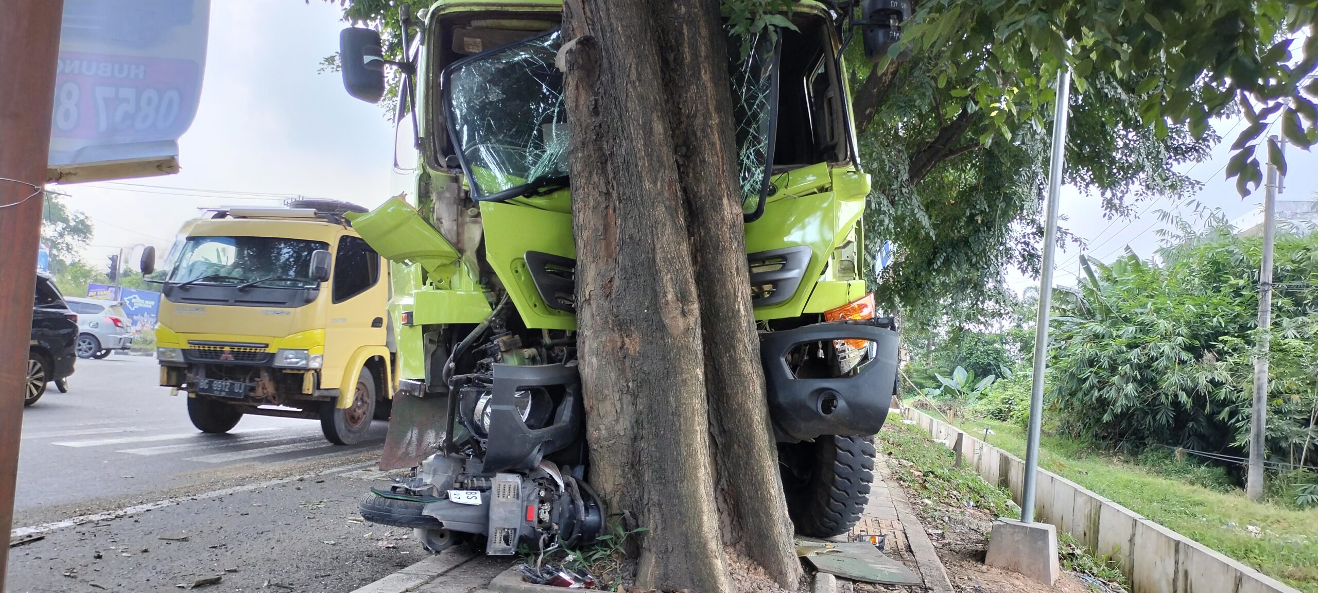 Berdasarkan informasi berhasil dihimpun, truk kontainer datang dari arah bandara hendak menuju arah macan lindung tiba di lokasi kejadian truk hilang kendali setelah rem blok langsung menabrak pohon dan pengemudi sepeda motor hingga ringsek.