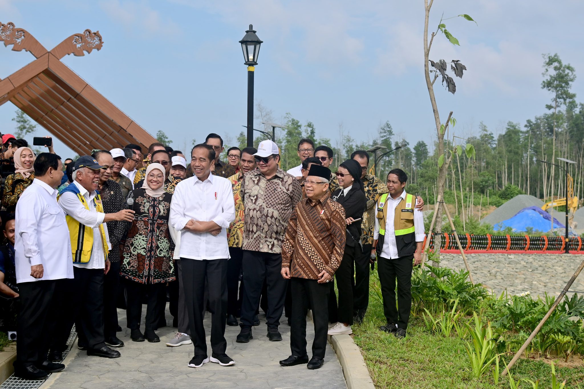 Dari Sumbu Kebangsaan, Presiden Jokowi kemudian mengajak para menteri menuju Istana Negara, simbol kekuasaan eksekutif di IKN. Sebelum memulai peninjauan lebih lanjut, Presiden terlebih dahulu mengajak seluruh menteri untuk berfoto bersama di halaman Istana Negara. Momen ini diabadikan sebagai tanda kebersamaan dan komitmen mereka dalam mewujudkan IKN sebagai ibu kota yang modern dan berwawasan lingkungan.