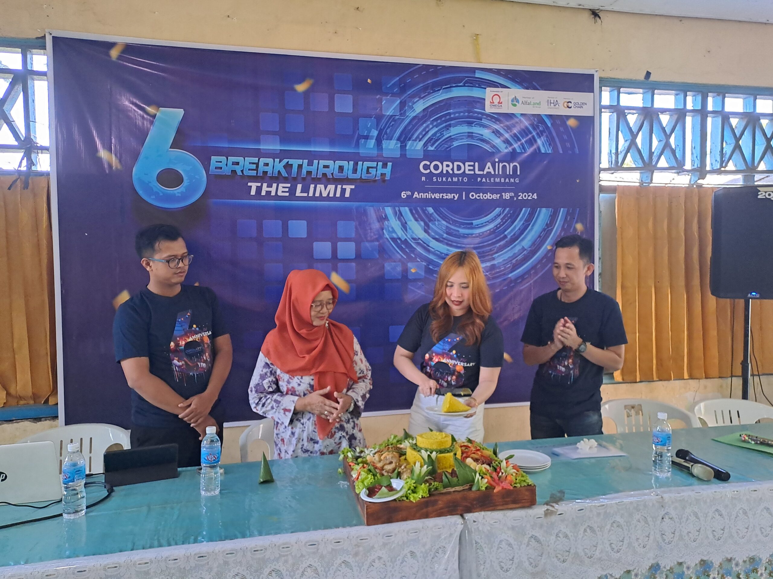 Feby Valentin General Manager Cordela Inn Palembang dalam penyampaiannya, sebelum pemotongan nasi tumpeng,  mengatakan “Dalam acara Anniversary kali ini penuh makna, yang mengusung tema Breakthrough The Limit untuk tetap memacu semangat seluruh karyawan hotel. Breakthrough The Limit sendiri artinya menembus batas, dengan artian kita dapat mempelajari dan memiliki kemampuan apa saja untuk memberdayakan segala sesuatu untuk menjadi peluang,” ujarnya. Jum’at (18/10/24).