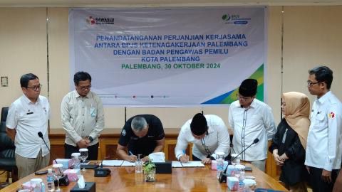 KORDANEWS — Badan Pengawas Pemilihan Umum (Bawaslu) Kota Palembang telah menandatangani perjanjian kerjasama dengan Badan Penyelenggara Jaminan Sosial (BPJS) Ketenagakerjaan Cabang Palembang.