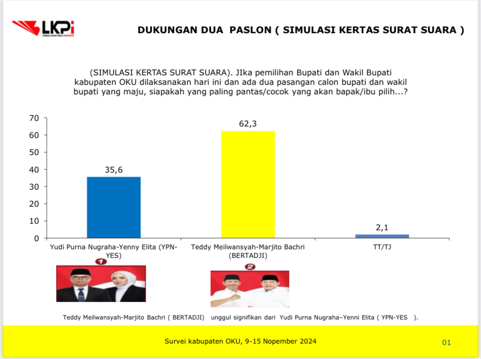 Tiga alasan utama tersebut membuat elektabilitas BERTAJI unggul signifikan dari Yudi Purna Nugraha-Yenny Elita (YPN-YES).