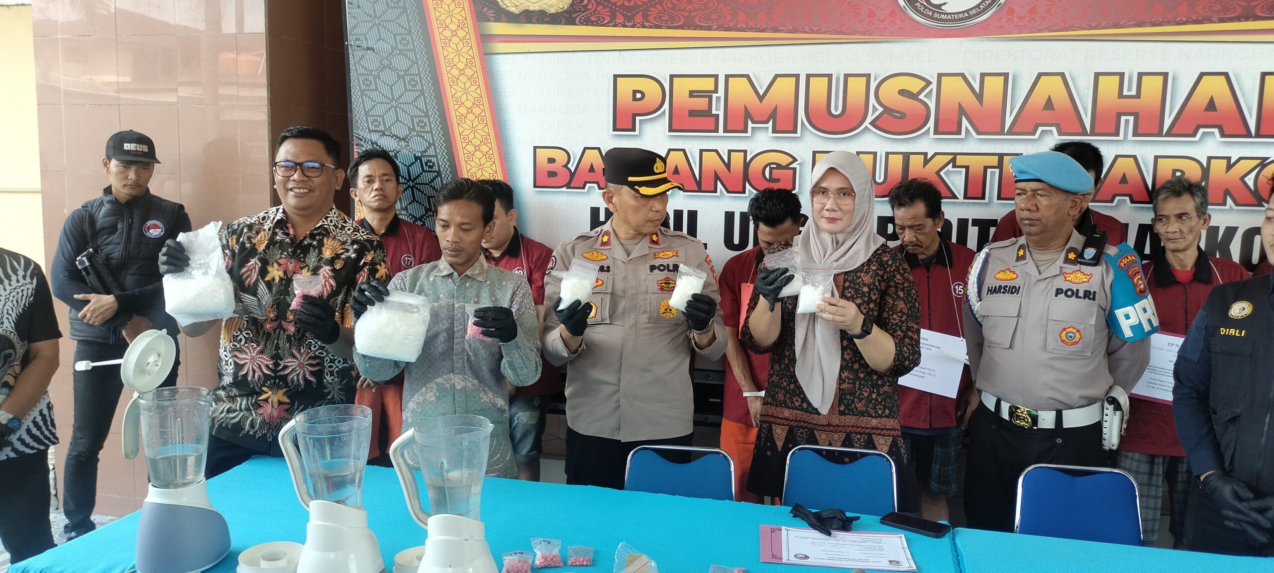 Kordanews – Ditresnarkoba Polda Sumsel musnahkan barang bukti narkotika jenis sabu dan ekstasi, barang haram tersebut di musnahkan dihadapan 10 orang tersangka. Jum’at (22/11/24).