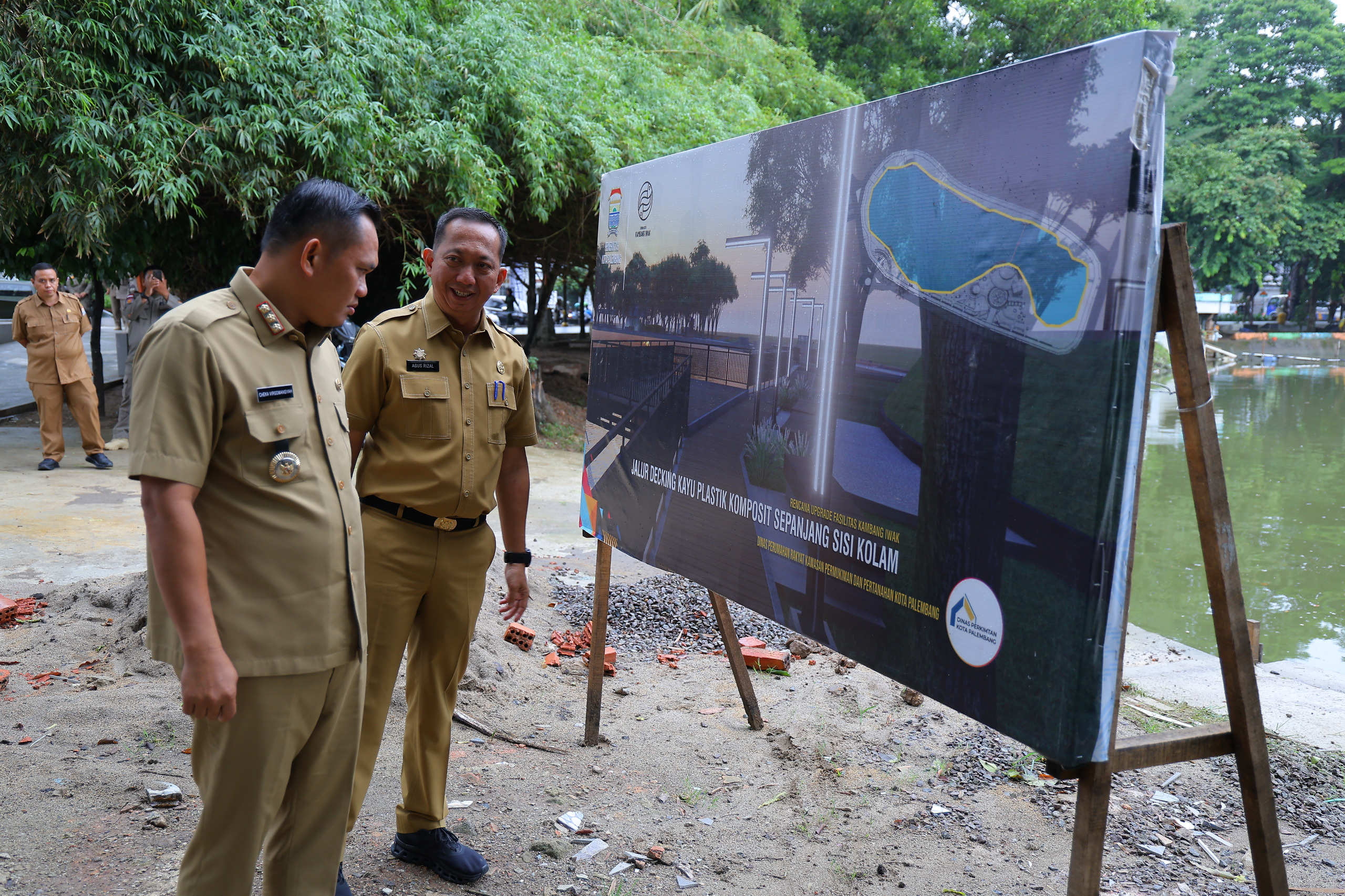 Pj Walikota Palembang, Dr. Cheka Virgowansyah., W.STP.,M.E didampingi langsung oleh Kepala Dinas Perkimtan Kota Palembang Agus Rizal, AP.,M.Si. dalam pemantauan progres Revitalisasi Kambang Iwak Palembang tersebut.