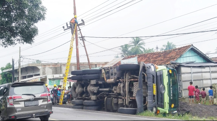 Petugas juga terpaksa memasang tiang baru, untuk menggantikan tiang listrik yang roboh ditabrak truk pengangkut batu koral.