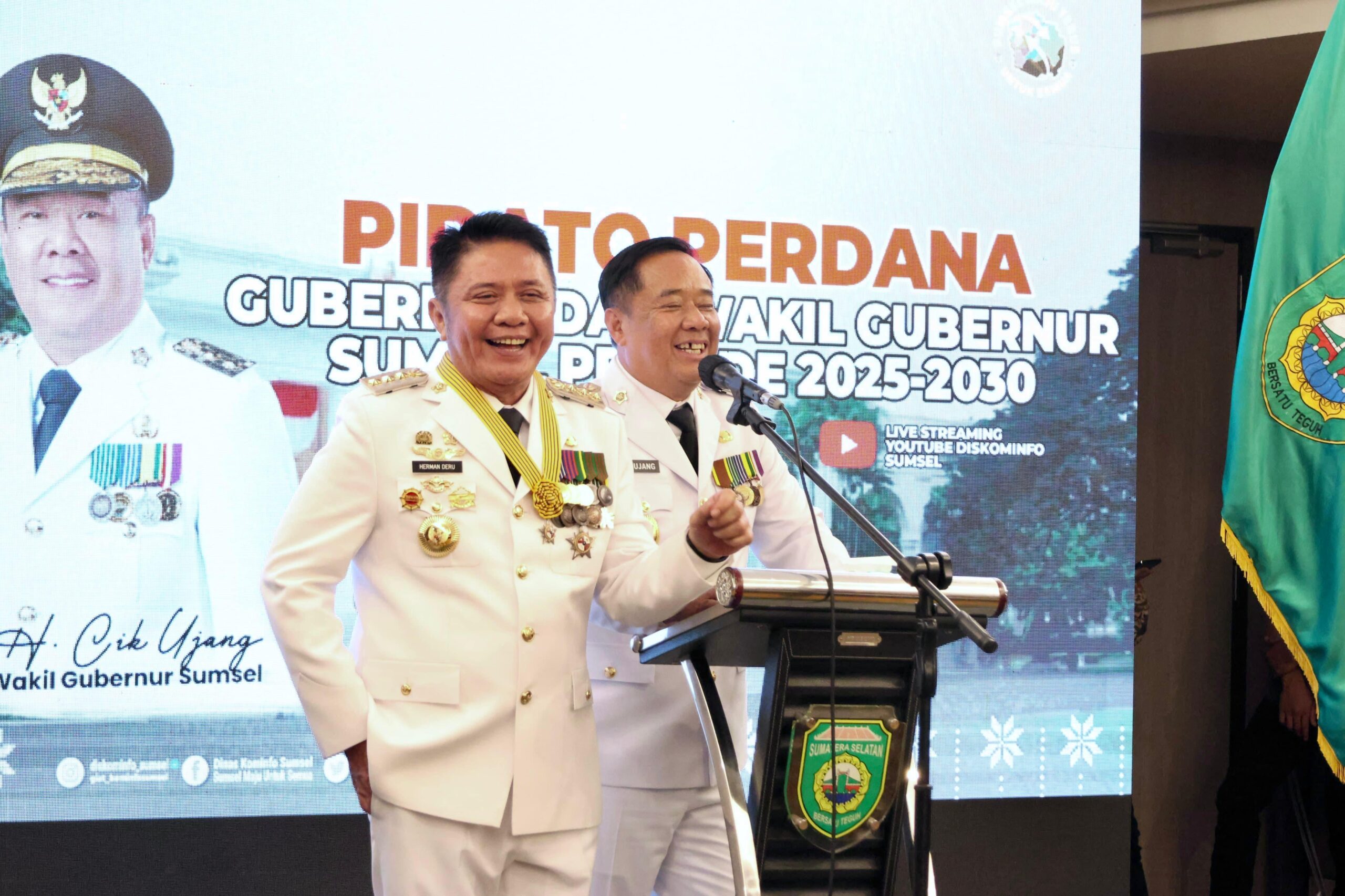 KORDANEWS — Usai dilantik secara resmi oleh Presiden Republik Indonesia (RI) Prabowo Subianto di Istana Kepresidenan Jakarta, Kamis (20/2/2025) pagi, Gubernur Sumsel H. Herman Deru (HD) melakukan pidato perdananya di Hotel Borobudur, Kamis (20/2/2025) siang. Herman Deru menyampaikan pidato perdananya yang dikemas dalam acara Ramah Tamah dan Silaturahmi itu didampingi Wakil Gubernur Sumsel H. Cik Ujang (CU).