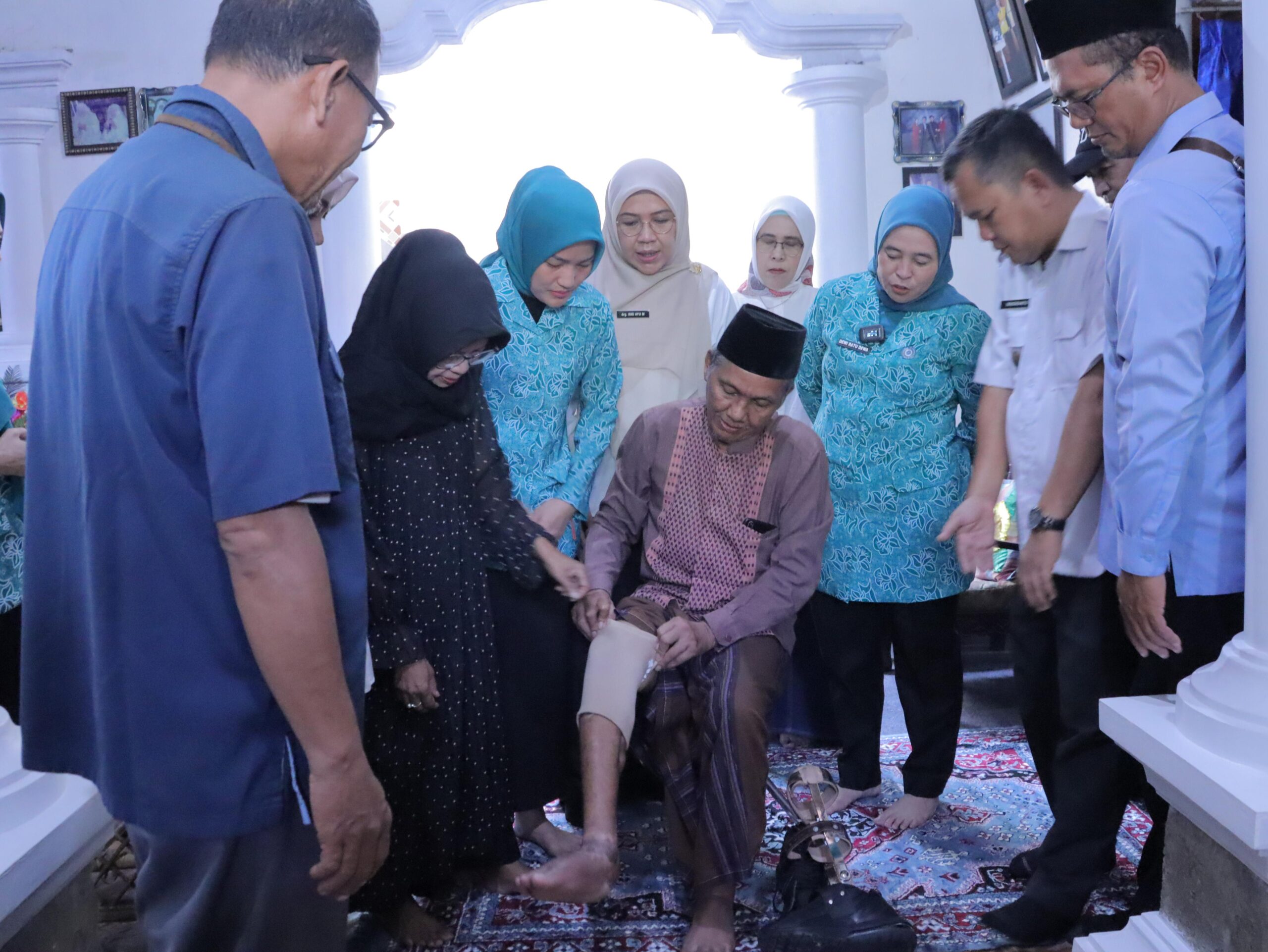 Ia yang tinggal bersama istri dan tiga orang anaknya di Jl. Kop.KKo Harun Said RT. 13 Rw. 07 Kelurahan Sungai Buah Kecamatan Ilir Timur 2, Rabu (14/5/2025) mendadak mendapat kunjungan langsung dari Ketua Tim Penggerak Pemberdayaan dan Kesejahteraan Keluarga (TP PKK) Kota Palembang Dewi Sastrani Ratu Dewa didampingin beberapa dinas terkait, secara langsung menyerahkan bantuan berupa alat pergelangan kaki lutut kepada Ramlan Isman.