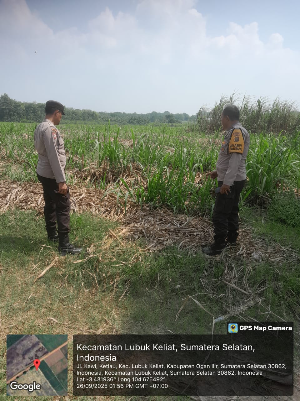 Patroli yang digelar sekitar pukul 13.45 WIB itu menyasar lahan perkebunan tebu milik PTPN VII Cinta Manis. Lokasi berada di titik koordinat -3.431922° 104.675471°, dengan luas lahan sekitar lima hektare. Vegetasi di area tersebut didominasi tebu tegak dengan daun kering, atau yang dikenal warga sebagai daduk. Kondisi itu dinilai rawan karena mudah terbakar pada musim kemarau.