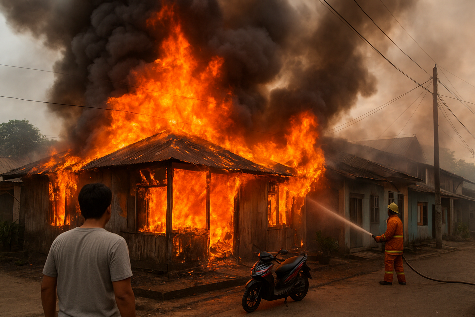 KORDANEWS – Kebakaran melanda kawasan Jalan Faqih Usman, Kelurahan 1 Ulu, Kecamatan SU I Palembang, Kamis (13/11/2025) sekitar pukul 16.00 WIB. Satu rumah semi permanen beserta satu unit motor matic ludes terbakar, sementara empat rumah warga lain terdampak pada bagian dapur dan depan bangunan.