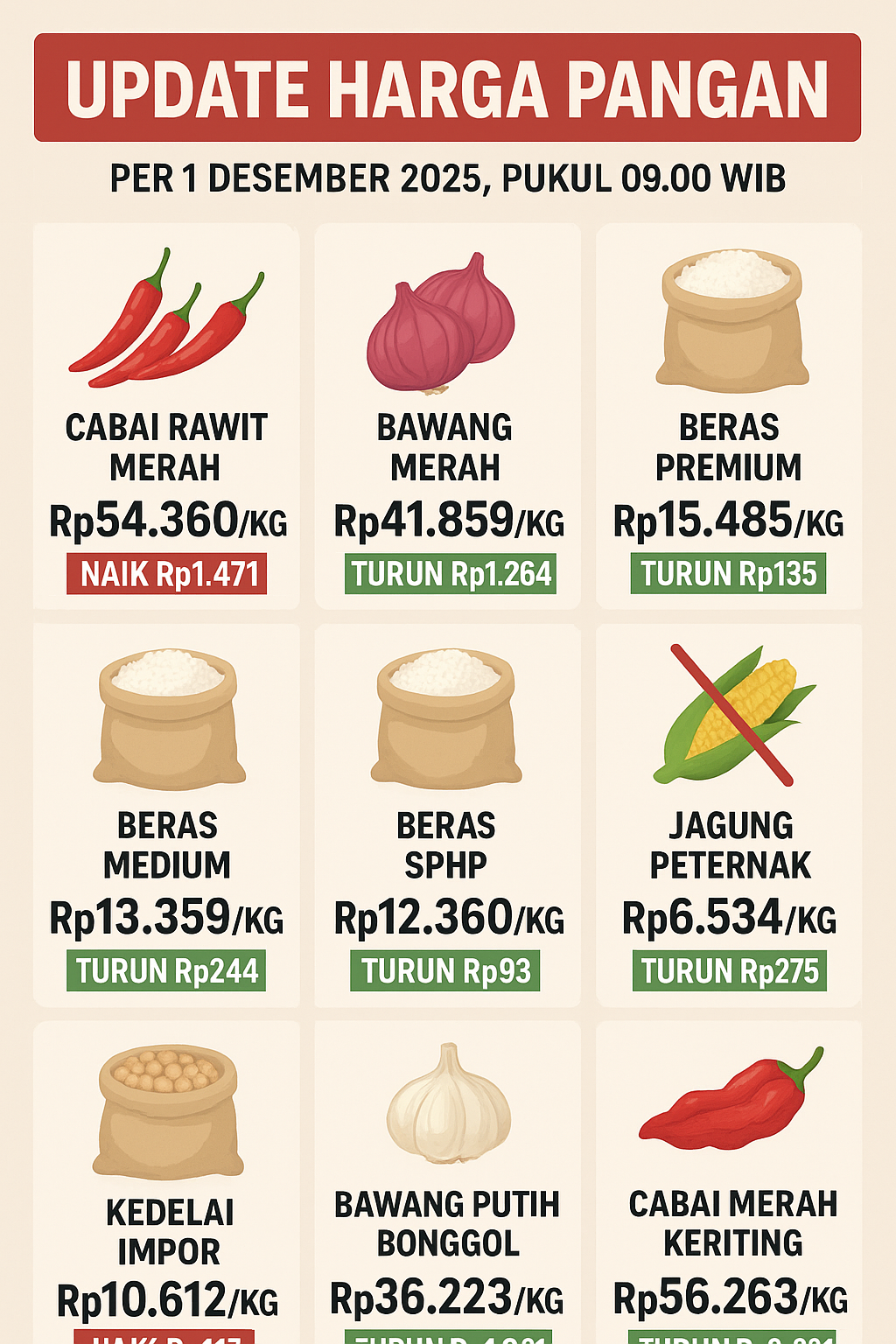KORDANEWS – Badan Pangan Nasional (Bapanas) mencatat pergerakan harga pangan nasional per 1 Desember 2025 pukul 09.00 WIB, dengan cabai rawit merah naik Rp1.471 menjadi Rp54.360 per kg, sementara bawang merah turun Rp1.264 menjadi Rp41.859 per kg.