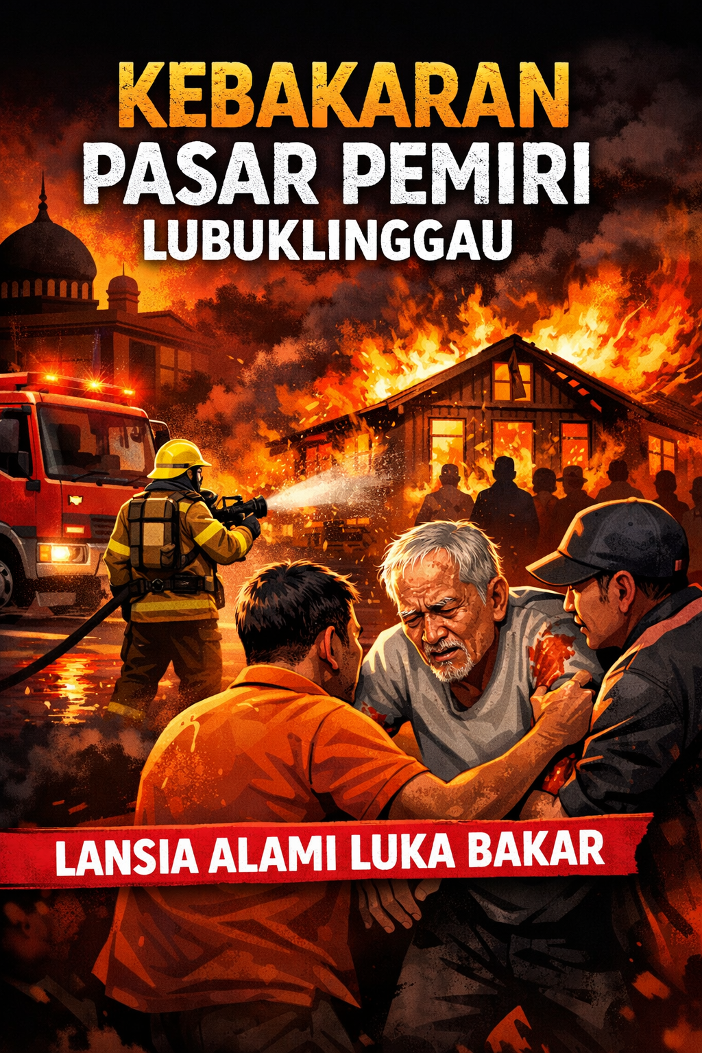 KORDANEWS – Kebakaran melanda kawasan padat penduduk di depan Kantor Telkom, Kelurahan Pasar Pemiri, Kecamatan Lubuklinggau Barat II, atau tepat di samping Masjid Raya Kota Lubuklinggau, Rabu malam (17/12/2025). Dalam peristiwa tersebut, seorang warga bernama Yanto (75) mengalami luka bakar dan harus dilarikan ke rumah sakit setelah berhasil diselamatkan warga dari kobaran api.