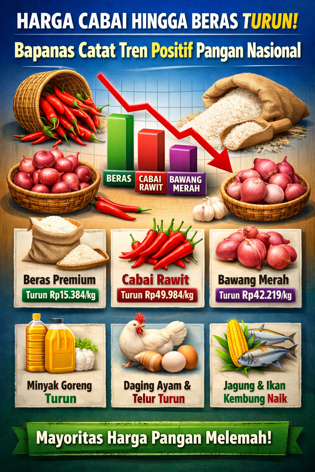 KORDANEWS – Badan Pangan Nasional (Bapanas) mencatat tren penurunan harga sejumlah komoditas pangan secara nasional. Harga cabai rawit merah turun Rp3.980 menjadi Rp49.984 per kilogram (kg), sementara bawang merah turun Rp1.688 menjadi Rp42.219 per kg.
