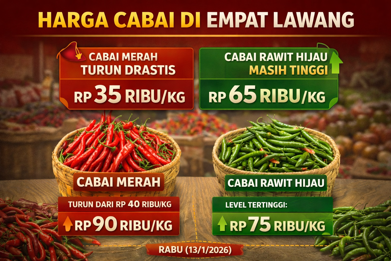 KORDANEWS – Harga cabai merah di Kabupaten Empat Lawang mengalami penurunan cukup signifikan pada Rabu (13/1/2026). Baik cabai merah keriting maupun cabai merah besar kini dijual di kisaran Rp35 ribu per kilogram, turun dari sebelumnya Rp40 ribu per kilogram.