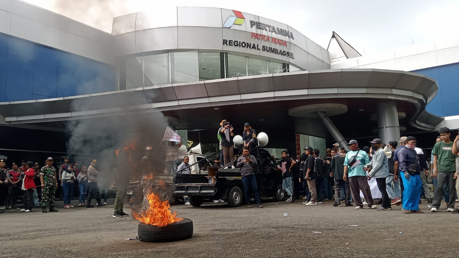 Massa memaksa masuk ke halaman kantor untuk bertemu manajemen, meski sempat dihalangi petugas keamanan. Aksi memanas saat massa membakar ban di depan kantor Pertamina Patra Niaga.