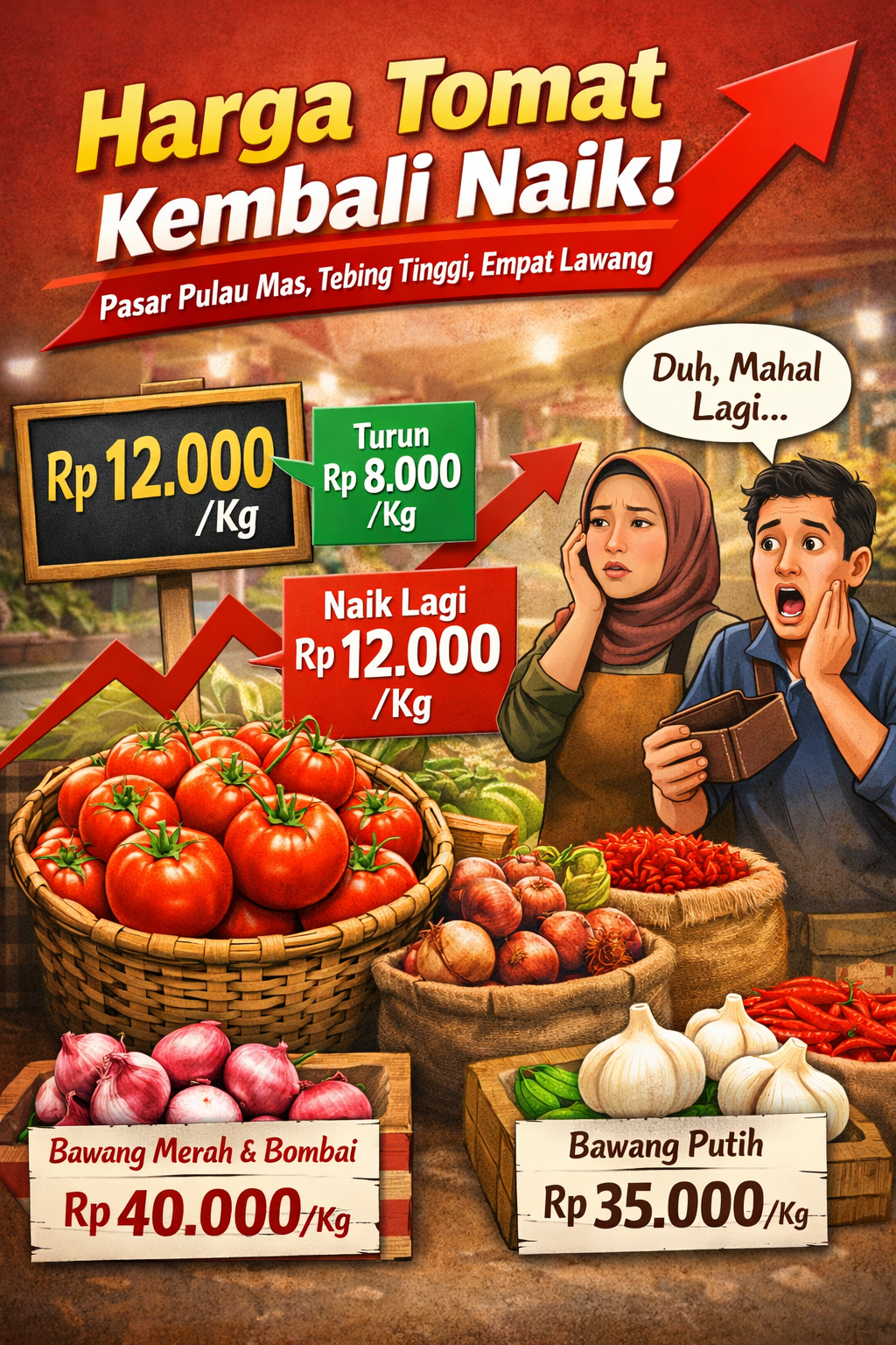 Saat ini, harga tomat kembali melonjak ke kisaran Rp12 ribu per kilogram, jauh di atas harga normal yang biasanya hanya Rp5 ribu hingga Rp6 ribu per kilogram. Pedagang menyebut fluktuasi harga terjadi dalam waktu singkat dan membuat pembeli harus kembali merogoh kocek lebih dalam.