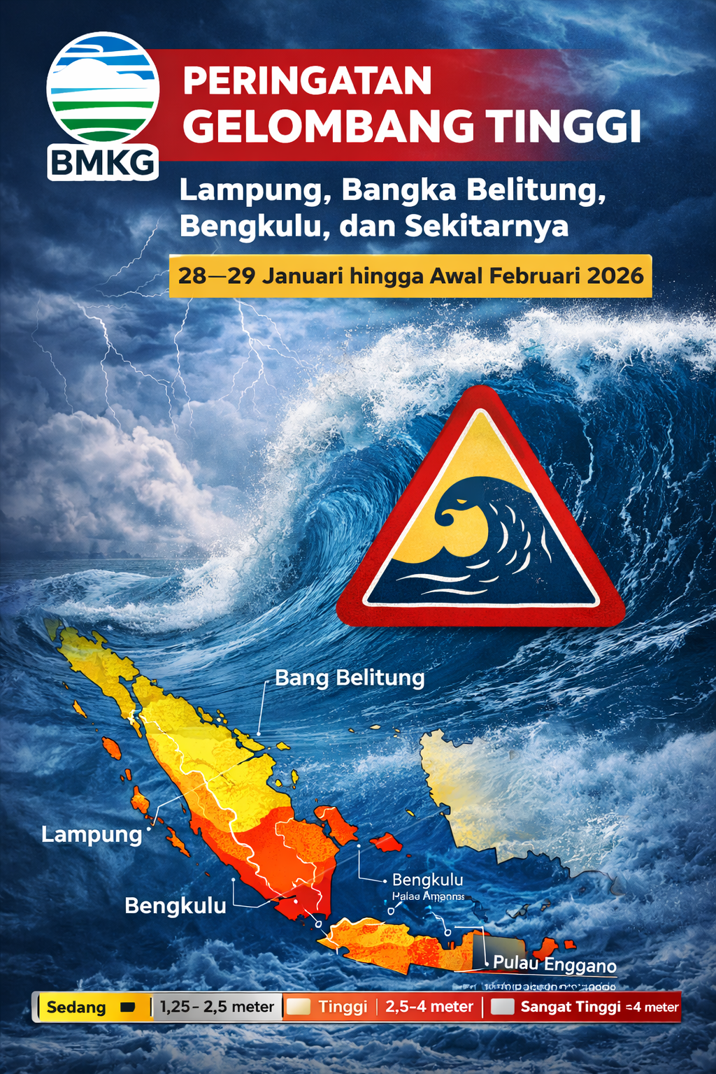 KORDANEWS – Badan Meteorologi, Klimatologi, dan Geofisika (BMKG) mengeluarkan peringatan gelombang tinggi di sejumlah wilayah perairan, meliputi Lampung, Bangka Belitung, Bengkulu, serta perairan sekitarnya, yang berlaku mulai 28–29 Januari hingga awal Februari 2026.
