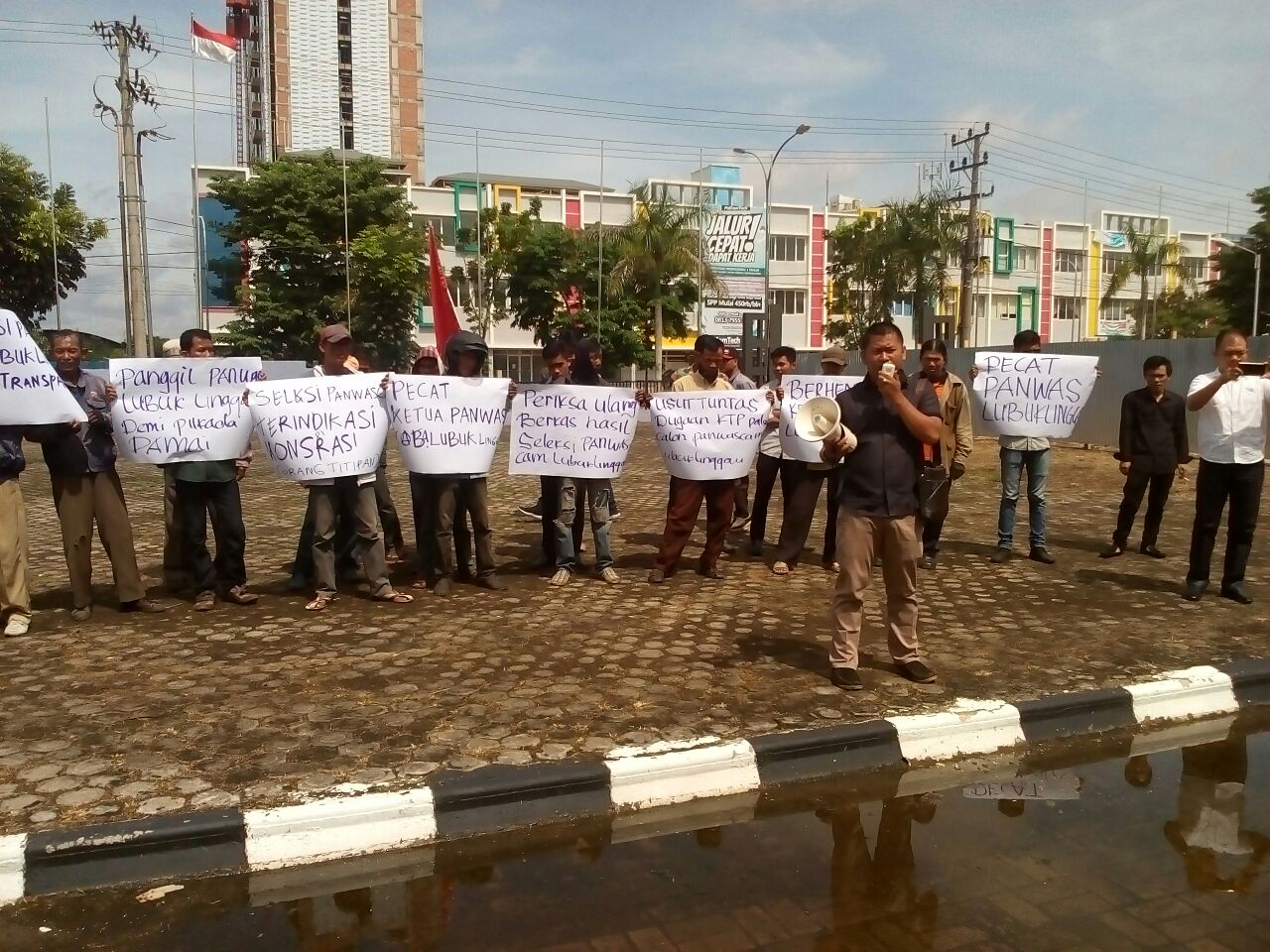 KORDANEWS – Puluhan massa yang menamakan diri Lembaga Independen Pemuda Peduli Bangsa (LIPPB) menggelar aksi unjuk rasa di halaman kantor Badan Pengawas Pemilu ( Bawaslu) Sumsel, Kamis (30/11). Mereka meminta Bawaslu memanggil Panwaslu Lubuklinggau terkait rekrutmen Panwascam se-Kota Lubuklinggau yang terindikasi terjadi kecurangan.