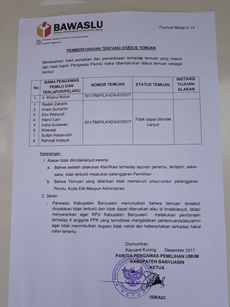 Anggota Panwaslu Banyuasin Divisi Penindakan Pelanggaran, Zulkifli ST dalam suratnya yang ditandatangani oleh Ketua Panwaslu setempat, Iswadi menegaskan, bahwa terkait hasil pemeriksaan adanya temuan sesuai dalam surat nomor : 001/TM/PILKADA/XI/2017 atas dugaan terhadap Ketua dan anggota dari 6 PPK mengikuti pertemuan dengan timses pasangan calon bupati dalam pilkada serentak tahun 2018 dan atas dugaan pengarahan dukungan terhadap pasangan calon bupati periode 2018-2023 dinyatakan tidak terbukti.